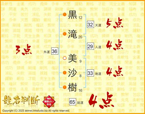 黒(12画)滝(20画) 美(9画)沙(8画)樹(16画)