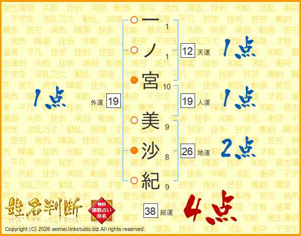 一ノ宮美沙紀さんの総運は38画の4点!