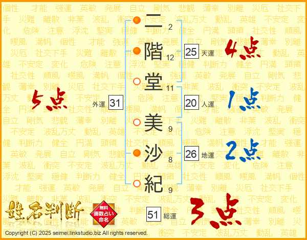 二(2画)階(12画)堂(11画) 美(9画)沙(8画)紀(9画)