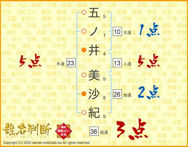 五(5画)ノ(1画)井(4画) 美(9画)沙(8画)紀(9画)