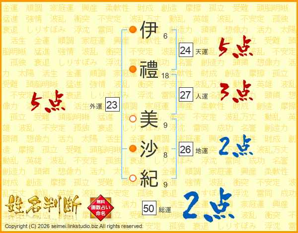 伊(6画)禮(18画) 美(9画)沙(8画)紀(9画)
