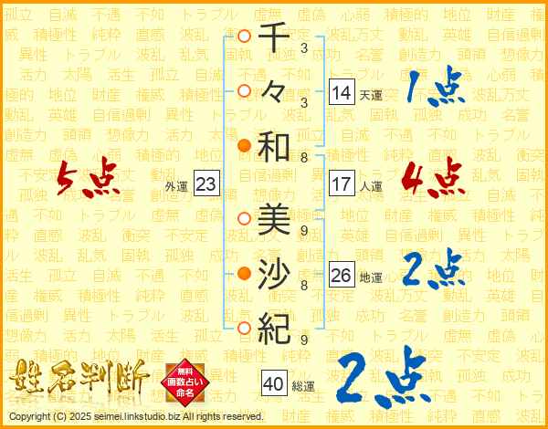 千(3画)々(3画)和(8画) 美(9画)沙(8画)紀(9画)