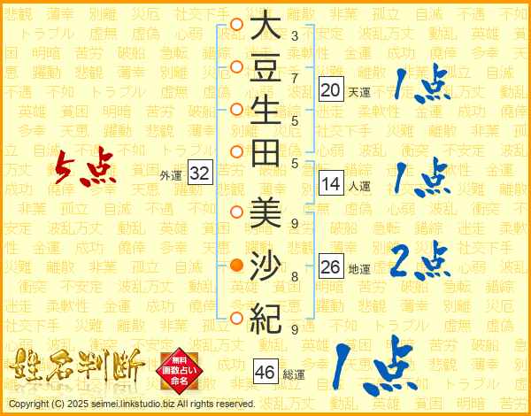 大(3画)豆(7画)生(5画)田(5画) 美(9画)沙(8画)紀(9画)
