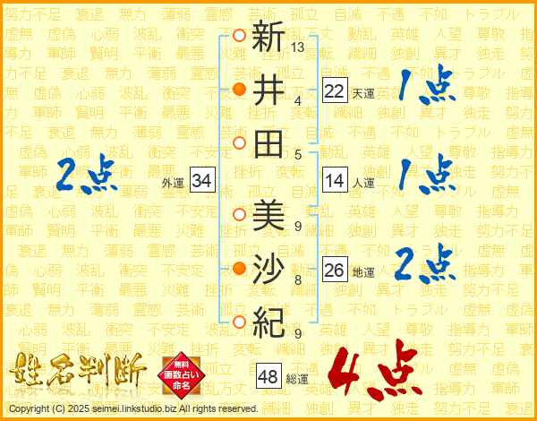 新(13画)井(4画)田(5画) 美(9画)沙(8画)紀(9画)