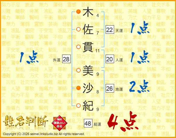 木(4画)佐(7画)貫(11画) 美(9画)沙(8画)紀(9画)