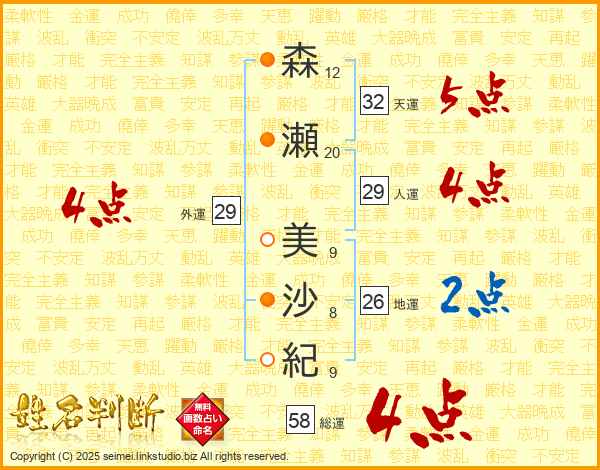 森(12画)瀬(20画) 美(9画)沙(8画)紀(9画)