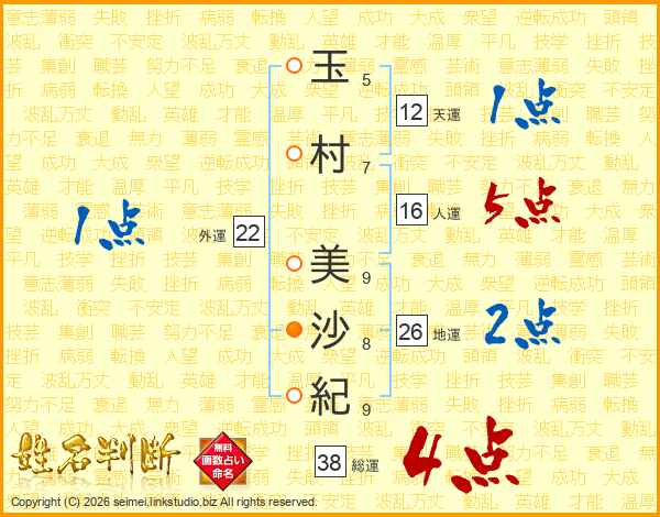 玉(5画)村(7画) 美(9画)沙(8画)紀(9画)