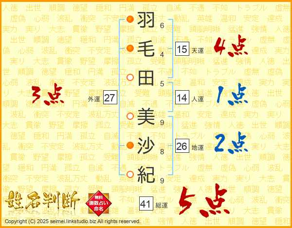 羽(6画)毛(4画)田(5画) 美(9画)沙(8画)紀(9画)