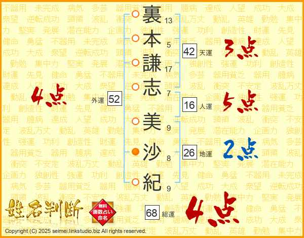 裏(13画)本(5画)謙(17画)志(7画) 美(9画)沙(8画)紀(9画)