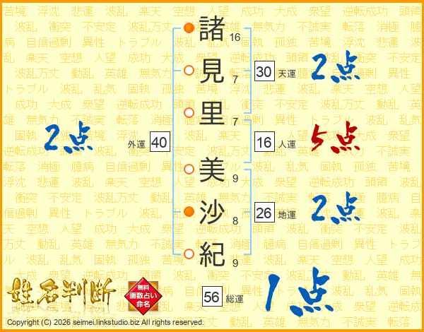 諸(16画)見(7画)里(7画) 美(9画)沙(8画)紀(9画)