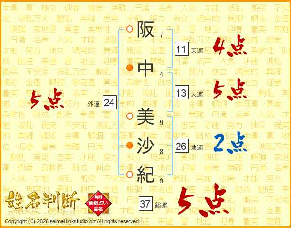 阪(7画)中(4画) 美(9画)沙(8画)紀(9画)
