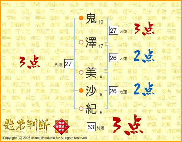 鬼(10画)澤(17画) 美(9画)沙(8画)紀(9画)