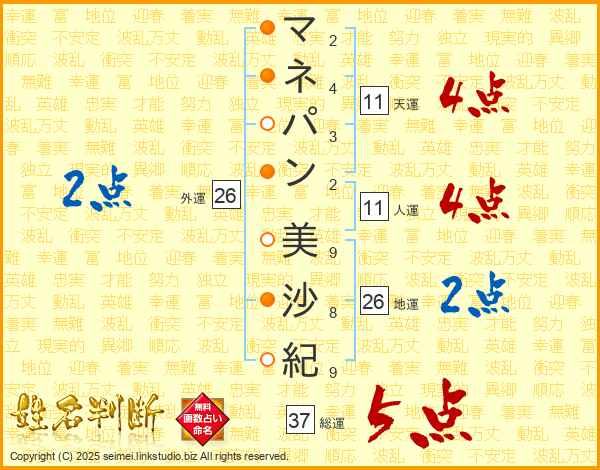 マ(2画)ネ(4画)パ(3画)ン(2画) 美(9画)沙(8画)紀(9画)