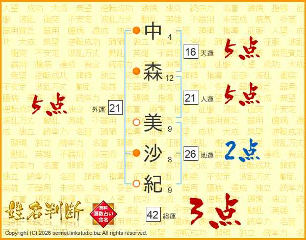 中(4画)森(12画) 美(9画)沙(8画)紀(9画)