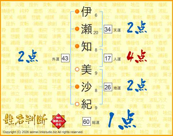 伊(6画)瀬(20画)知(8画) 美(9画)沙(8画)紀(9画)
