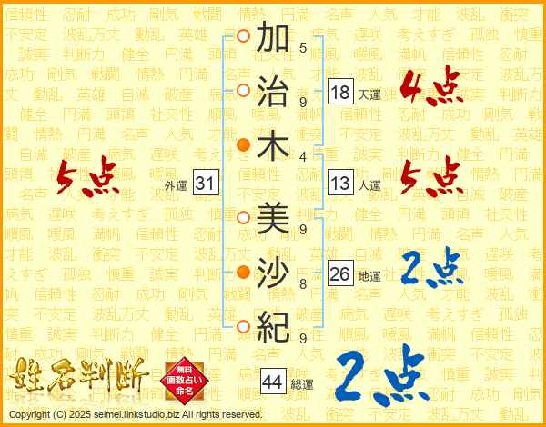 加(5画)治(9画)木(4画)  美(9画)沙(8画)紀(9画)