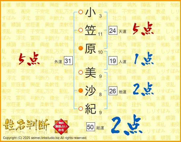 小(3画)笠(11画)原(10画) 美(9画)沙(8画)紀(9画)