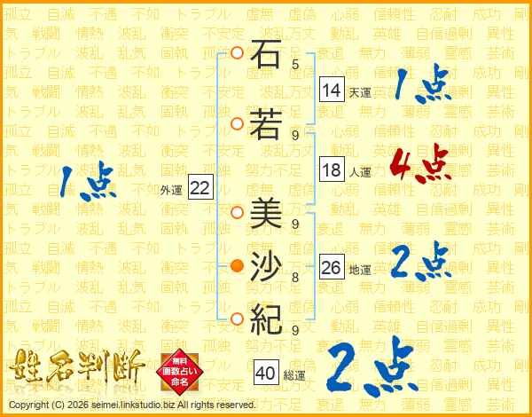 石(5画)若(9画) 美(9画)沙(8画)紀(9画)