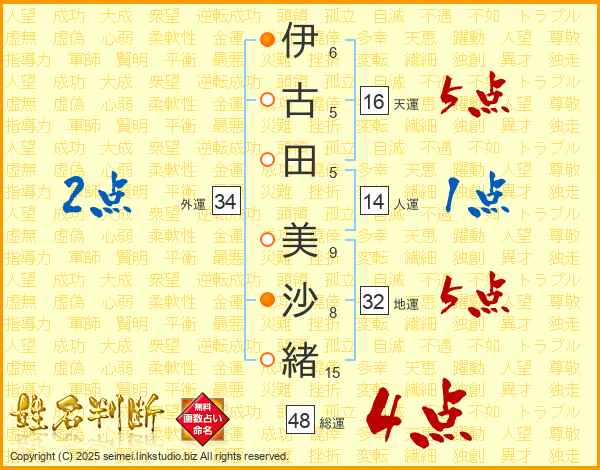伊(6画)古(5画)田(5画) 美(9画)沙(8画)緒(15画)