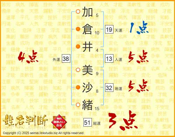 加(5画)倉(10画)井(4画) 美(9画)沙(8画)緒(15画)
