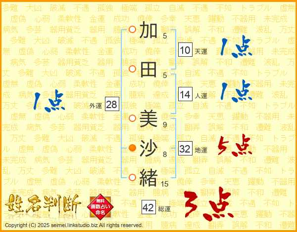 加(5画)田(5画) 美(9画)沙(8画)緒(15画)