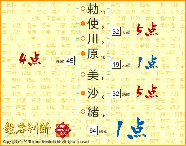 勅(11画)使(8画)川(3画)原(10画) 美(9画)沙(8画)緒(15画)