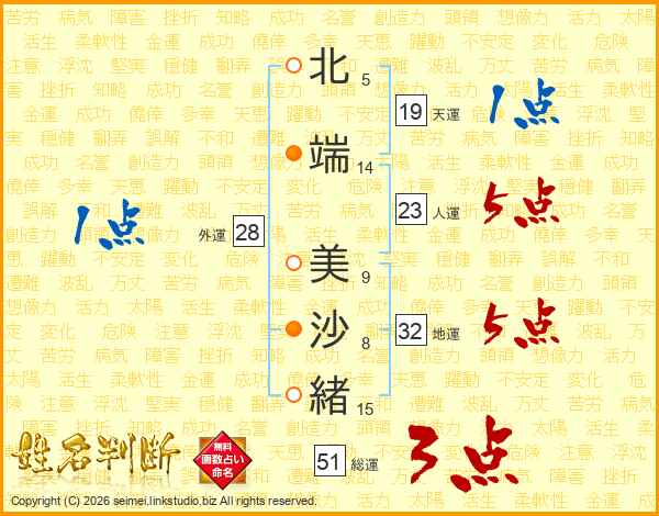北(5画)端(14画) 美(9画)沙(8画)緒(15画)