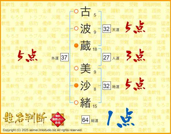 古(5画)波(9画)蔵(18画) 美(9画)沙(8画)緒(15画)