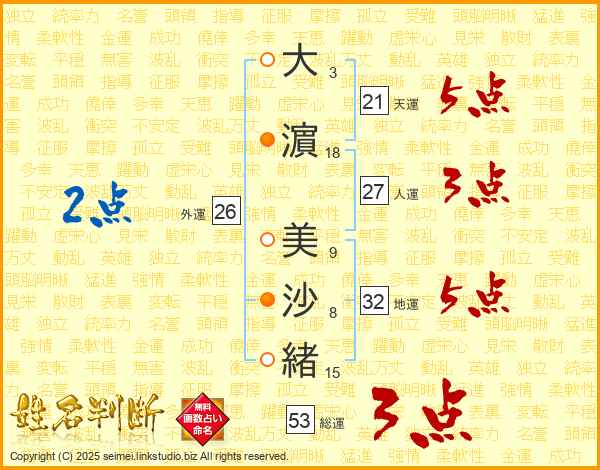 大(3画)濵(18画) 美(9画)沙(8画)緒(15画)