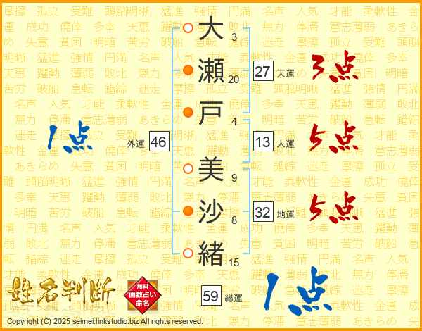 大(3画)瀬(20画)戸(4画) 美(9画)沙(8画)緒(15画)
