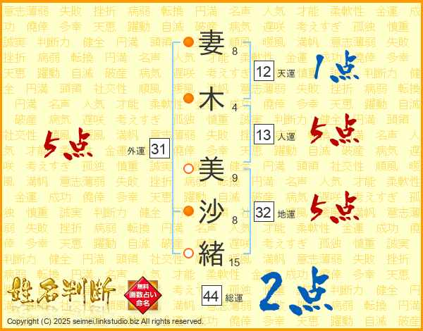 妻(8画)木(4画) 美(9画)沙(8画)緒(15画)