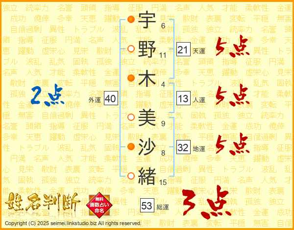 宇(6画)野(11画)木(4画) 美(9画)沙(8画)緒(15画)