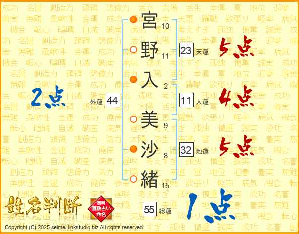 宮(10画)野(11画)入(2画) 美(9画)沙(8画)緒(15画)
