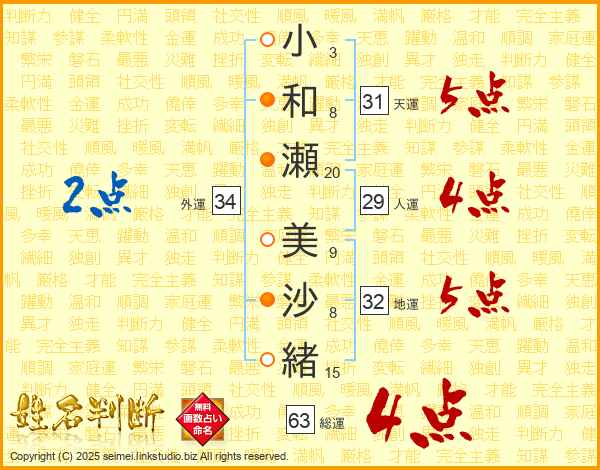 小(3画)和(8画)瀬(20画) 美(9画)沙(8画)緒(15画)