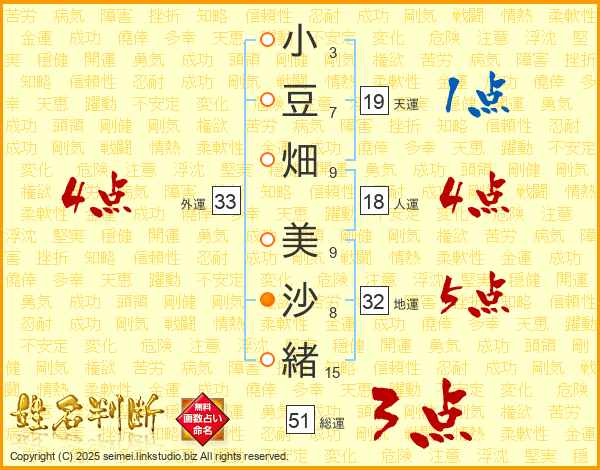 小(3画)豆(7画)畑(9画) 美(9画)沙(8画)緒(15画)