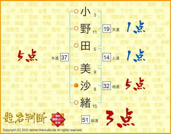 小(3画)野(11画)田(5画) 美(9画)沙(8画)緒(15画)
