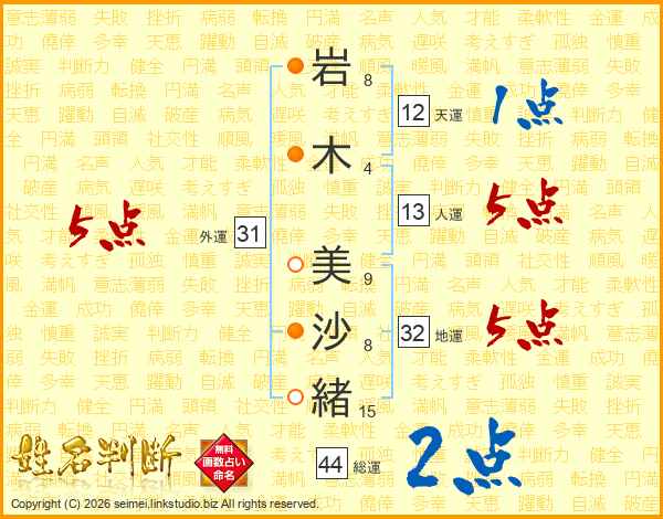 岩木美沙緒さんの総運は44画の2点!