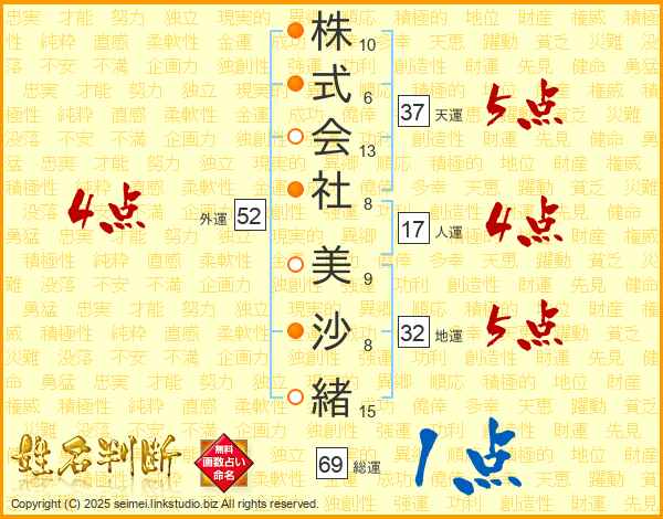 株(10画)式(6画)会(13画)社(8画) 美(9画)沙(8画)緒(15画)