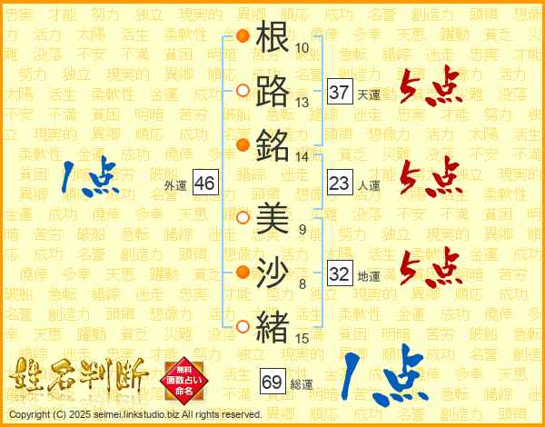 根(10画)路(13画)銘(14画) 美(9画)沙(8画)緒(15画)
