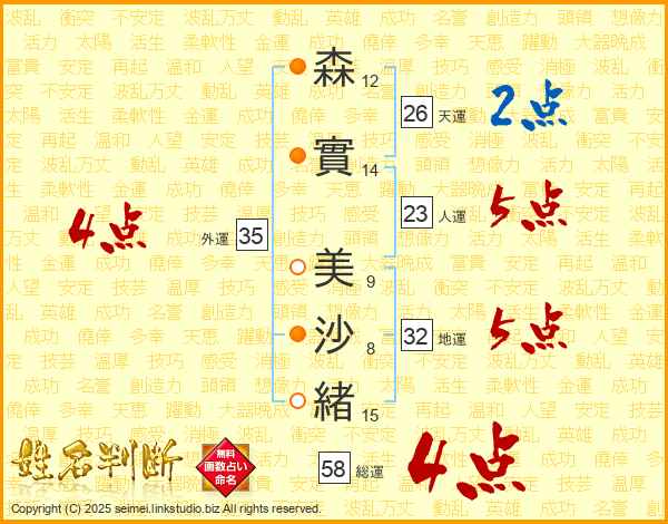 森(12画)實(14画) 美(9画)沙(8画)緒(15画)