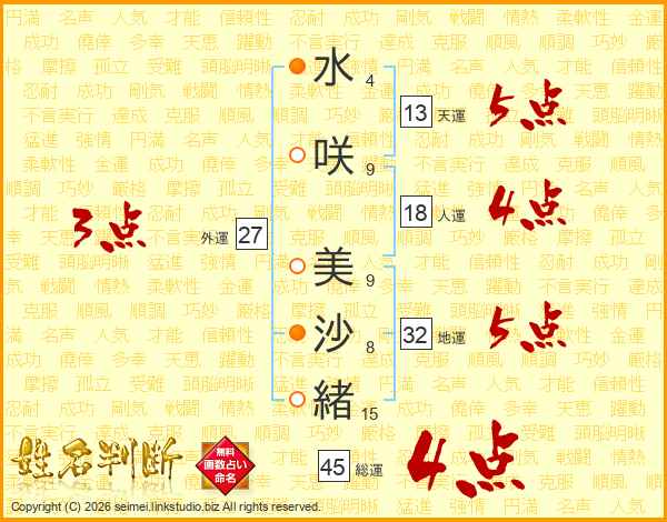 水(4画)咲(9画) 美(9画)沙(8画)緒(15画)