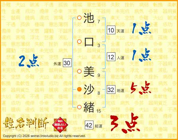 池(7画)口(3画) 美(9画)沙(8画)緒(15画)