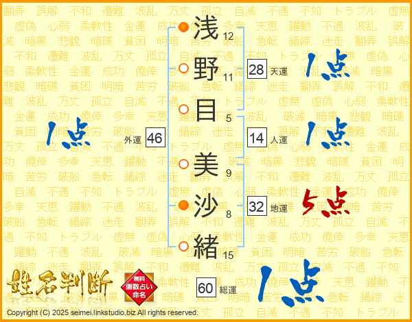 浅(12画)野(11画)目(5画) 美(9画)沙(8画)緒(15画)