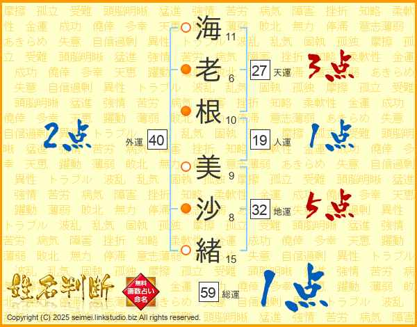 海(11画)老(6画)根(10画) 美(9画)沙(8画)緒(15画)