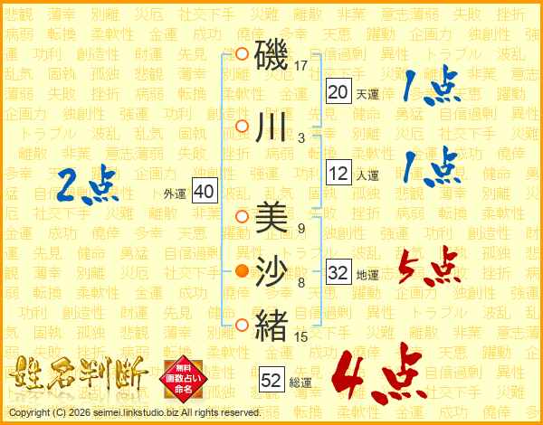 磯(17画)川(3画) 美(9画)沙(8画)緒(15画)