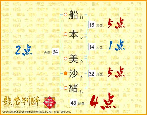 船(11画)本(5画) 美(9画)沙(8画)緒(15画)