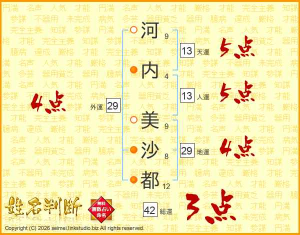河(9画)内(4画) 美(9画)沙(8画)都(12画)