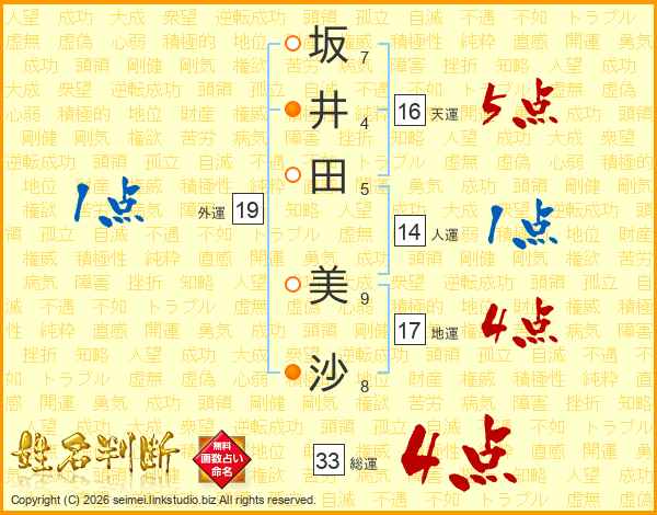坂(7画)井(4画)田(5画) 美(9画)沙(8画)