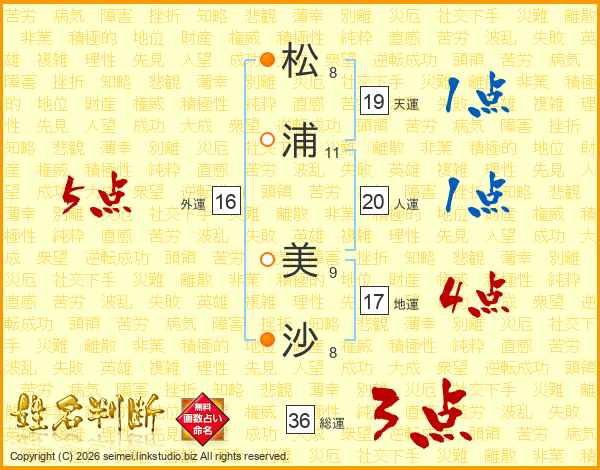 松(8画)浦(11画) 美(9画)沙(8画)