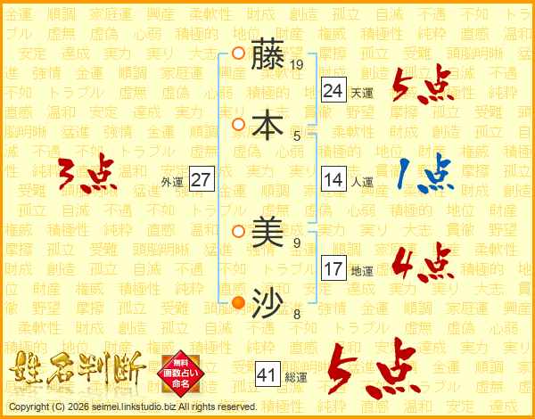 藤(19画)本(5画) 美(9画)沙(8画)